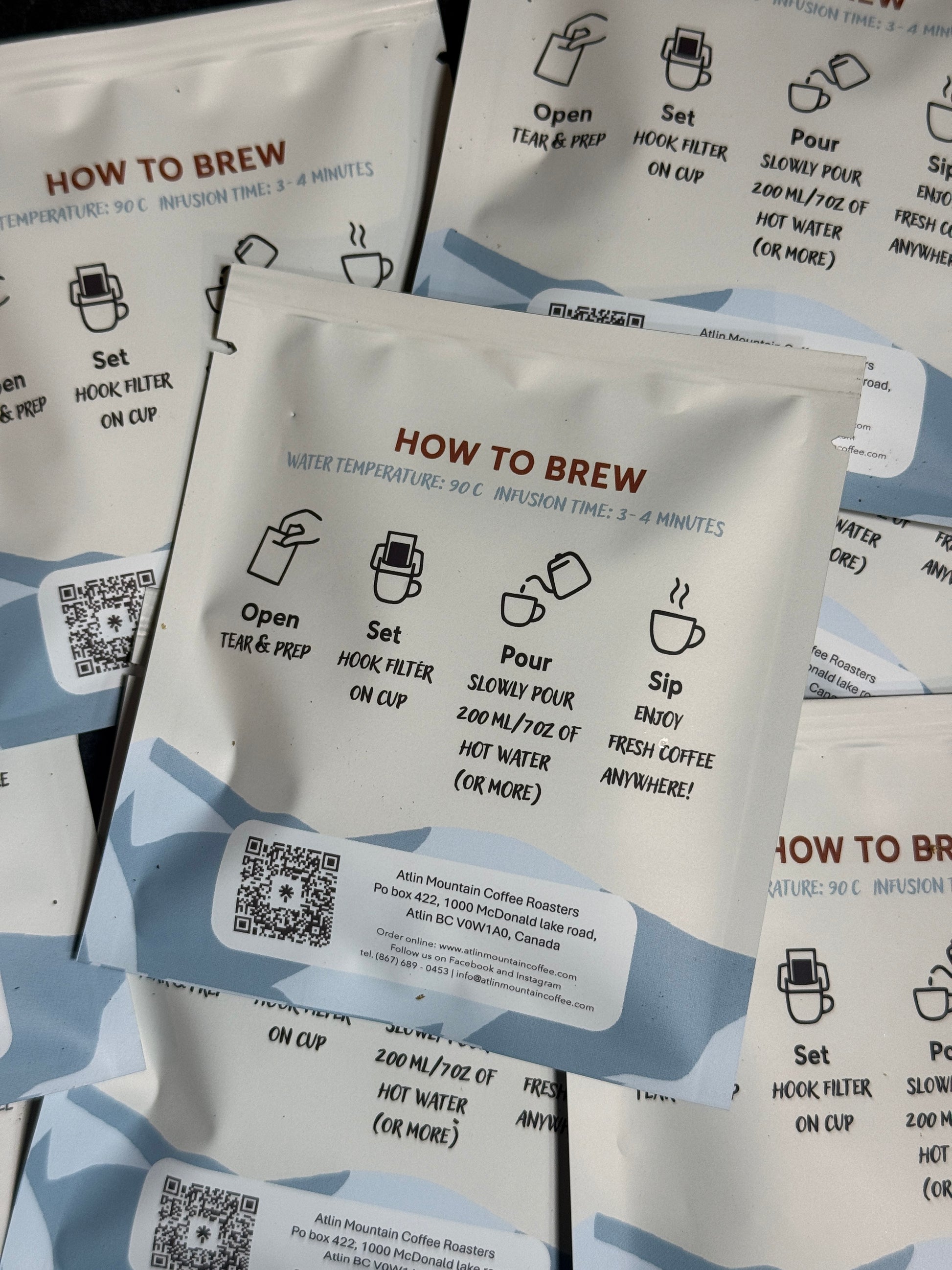 Enjoy rich, fresh-roasted coffee anywhere your adventure takes you. Our single-serve pour-over coffee packs are lightweight, mess-free, and perfect for camping, road trips, hiking, or busy mornings at work. Each pack contains freshly roasted Atlin Mountain Coffee, ground and sealed for maximum flavour.